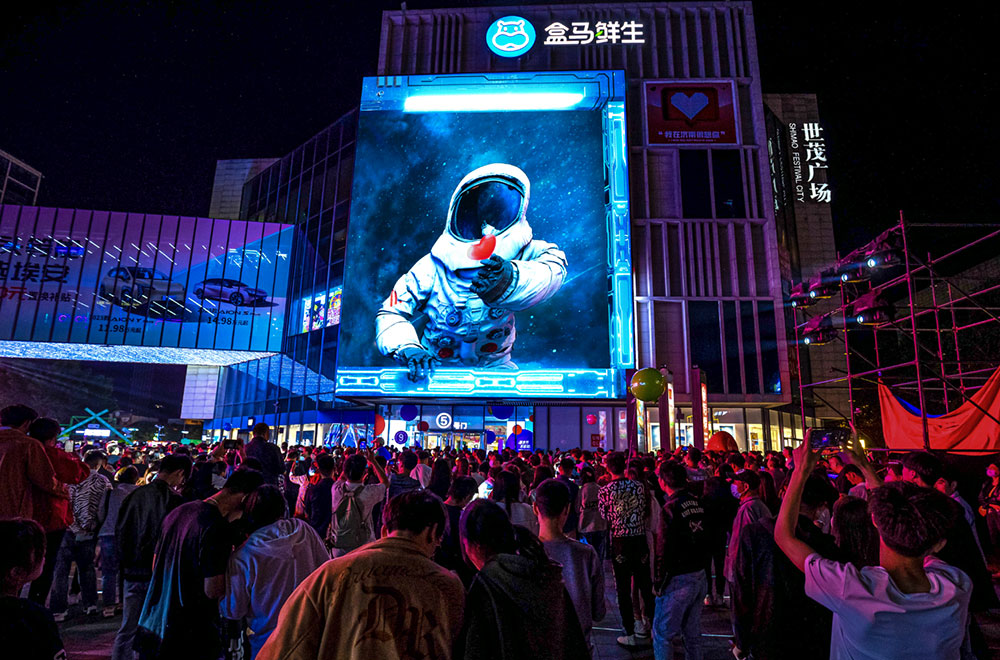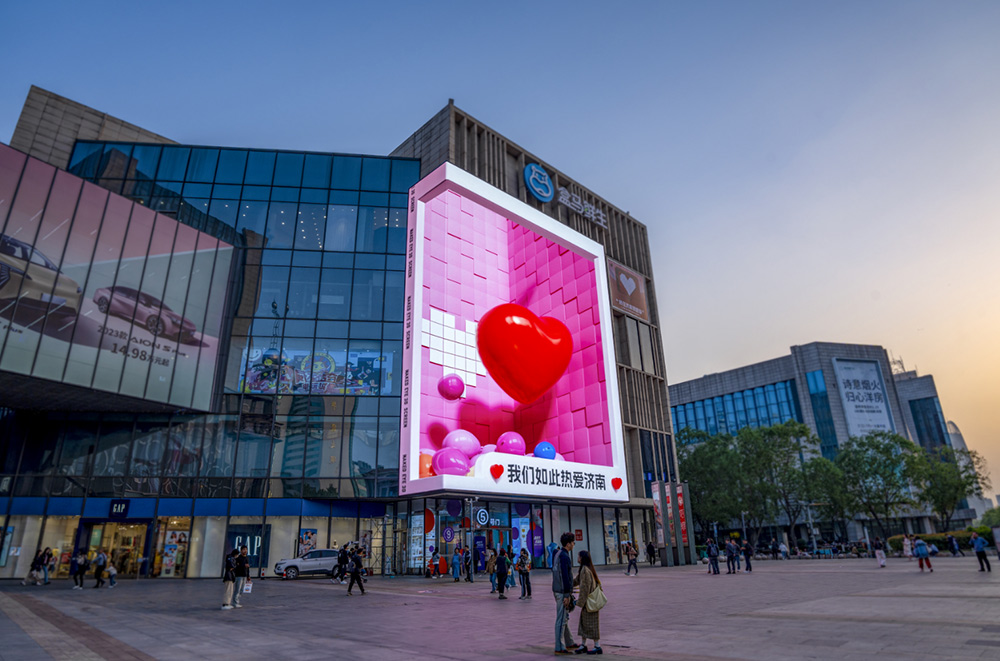 逼真動人的場景,強烈的視覺沖擊,一切仿若就在眼前……濟南世茂裸眼3D大屏位于城市中心商圈,吸睛效果顯著。這塊L型轉角超高清屏幕總面積達面積高達608.85平方,轉角處采用曲面平滑技術,突出傳統,實現無縫鏈接的裸眼3D效果。屏幕下方和連廊橋下方安裝了4組JBL線陣音響設備,可以實現音畫同步,實時進行轉播或直播。結合“5G直播+4K裸眼3D+高清視頻制作”的方式,將城市厚重的文化底蘊、豐富的旅游資源、獨特的人文風情、多樣的美食特產,集聚于視覺的感官當中,帶給觀眾身臨其境的3D超燃震撼效果。