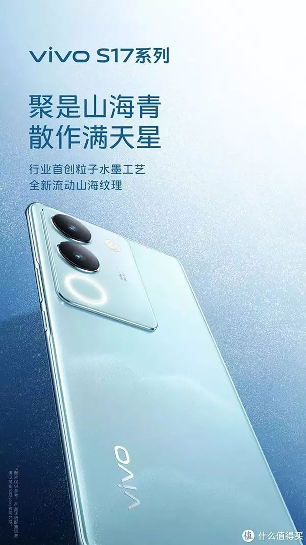 海報中展示的vivo S17系列全新的山海青配色,如同青衣少年奔赴山海,點燃內心的熱愛,十分抓眼。這種配色獨特且深入人心,機身后蓋仿佛點綴著千萬繁星,同時還融入了東方靈動的美學元素,相信能夠為消費者帶來全新的視覺體驗。