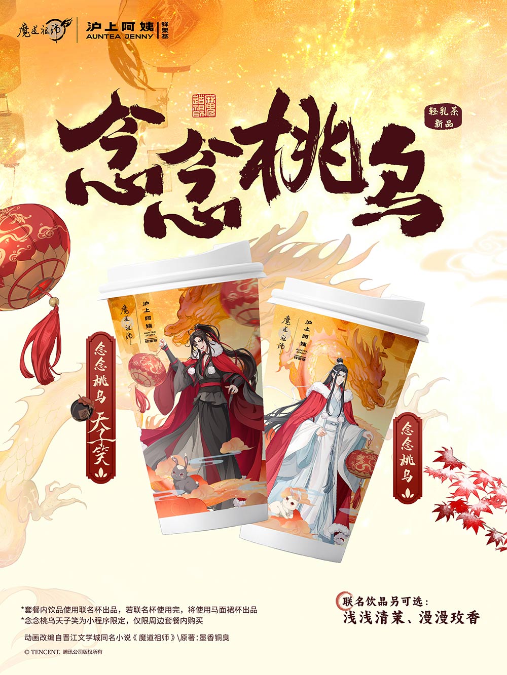 滬上阿姨與《魔道祖師》的聯(lián)名以輕乳茶為主要產(chǎn)品,取名為“念念桃烏”,“念念桃烏” 是一款不含酒精卻有白酒風(fēng)味的飲品,對應(yīng)聯(lián)名IP劇情中的“天子笑”元素。品牌準(zhǔn)備了設(shè)計精美的龍年主題聯(lián)名杯子,將魏無羨和藍忘機的形象印在了同一款聯(lián)名產(chǎn)品的AB面上,使其更貼合聯(lián)名主題。