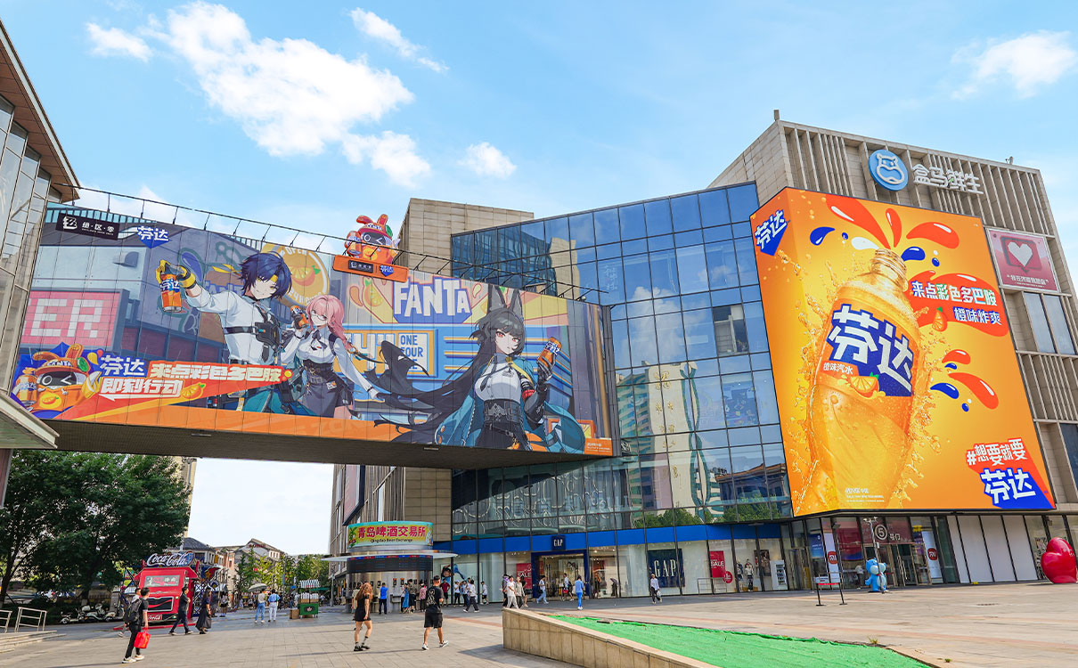 (世茂廣場(chǎng)(寬厚里)·裸眼3D戶外LED屏 世茂廣場(chǎng)(寬厚里)連廊橋橋體廣告(北側(cè)) 上刊品牌:芬達(dá))