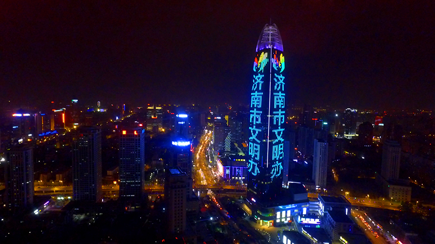 為進一步擴大創建文明城市宣傳途徑,拓寬公益廣告宣傳平臺,濟南市文明辦經過協調安排,在4月14日、15日晚上6點——10點利用“齊魯第一高”濟南市綠地中心樓體外泛光打出了“創建文明城市 爭做文明市民 濟南市文明辦”的宣傳標語。