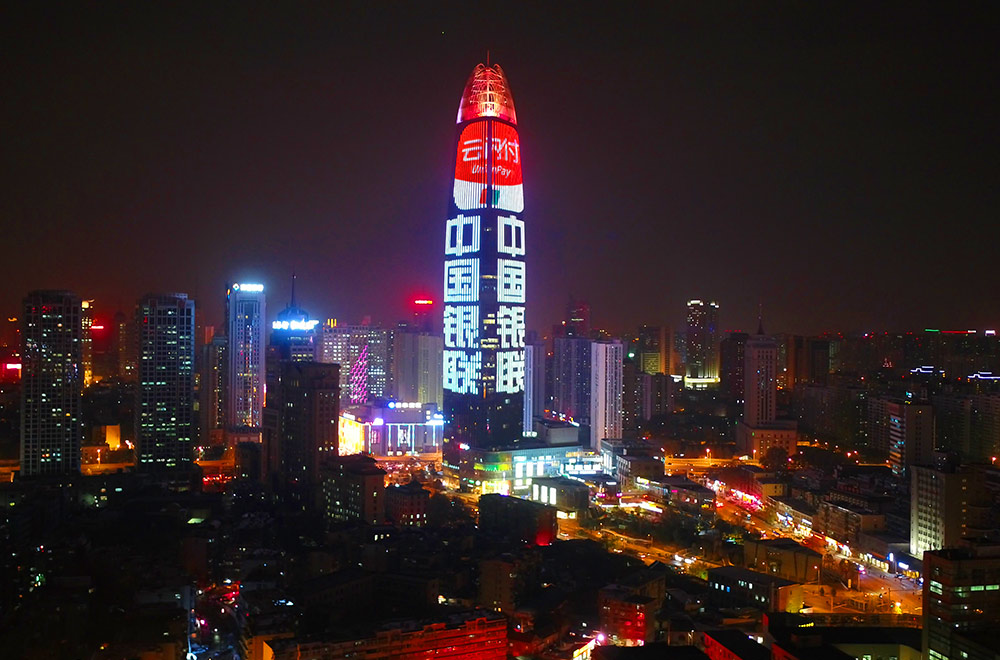 (中國銀聯投放濟南地標媒體-濟南綠地中心第一高媒廣告)