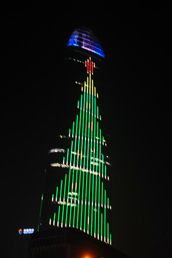 12月25日,山東濟南,共青團路上濟南地標燈光秀,驚現303米巨型“圣誕樹”,閃閃發光吸引眾多市民觀看。無論是泉城廣場還是大明湖畔還是在順河高架橋上駛過,這棵“圣誕樹”在濟南的許多位置都可以看到