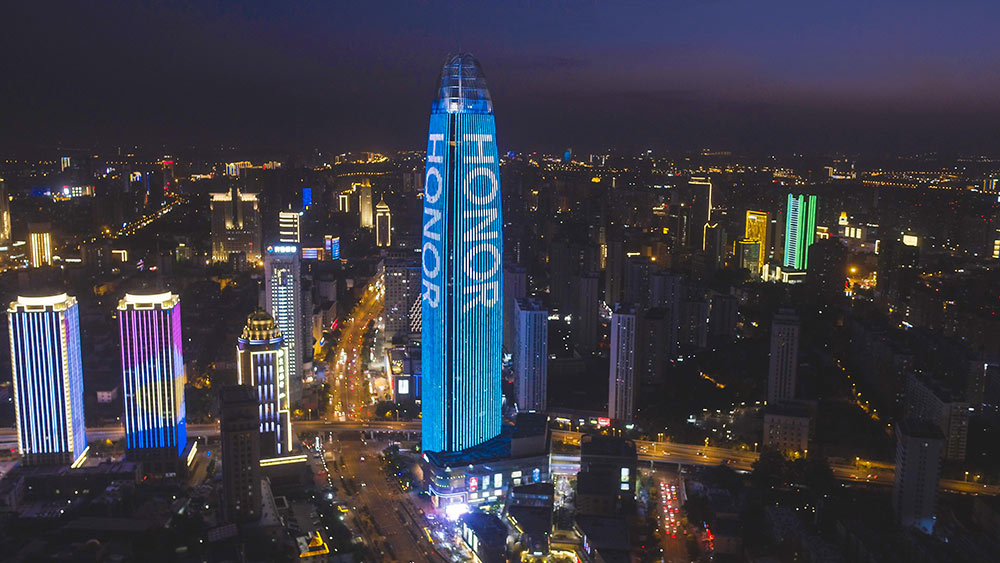 為了更好的烘托活動效果,榮耀手機攜手山東華途文化傳媒有限公司,登頂濟南地標媒體用酷炫的燈光秀告訴泉城人民,在今夜在此時榮耀X10走向我們。