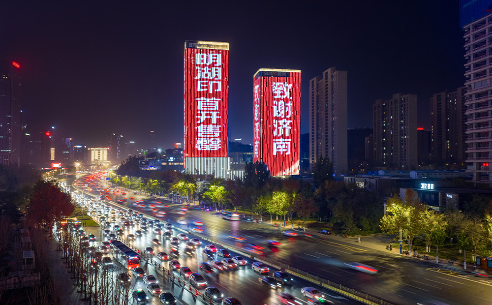 濟南經十路·城發成家財富中心雙塔燈光秀處于濟南CBD軸心地段置,是山東省的地標性建筑(城發成家財富中心)樓體的外泛光廣告,有效可視傳播距離在6KM以上,輻射覆蓋直徑10公里的傳播范圍;緊鄰龍奧大廈、喜來登酒店、萬象城、山東博物館、山東美術館,周邊集政務、商業、文化于一體。“隨處可見”的廣告效果和魅力,讓品牌快速占領城市C位位置,每日人車流量可達2,350,000+。